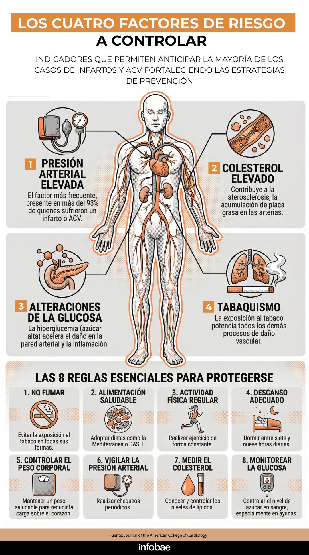La Asociación Americana del Corazón destaca “las 8 reglas esenciales para la vida”: no fumar, alimentación saludable (como la dieta mediterránea y la dieta DASH), actividad física regular, dormir entre siete y nueve horas diarias, controlar el peso y realizar chequeos periódicos de presión, colesterol y glucosa.